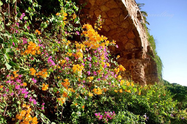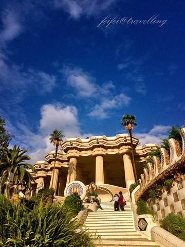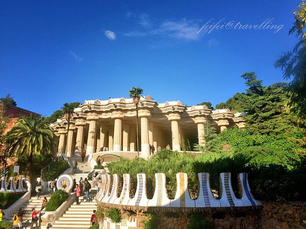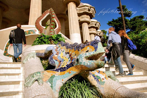 在公园的入口处,有两座奇异的立体喷泉,一个是代表加泰罗尼亚的守护神--变色龙另一个是加泰罗尼亚的徽章--巨型蜥蜴。表面均采用马赛克瓷片拼成,色泽艳丽而造型生动。除作为公园的主题象征和镇园之宝外,它们还兼有重要的排水功能。每当大雨滂沱时,蜥蜴和变色龙的嘴中就会喷涌出从百柱厅下泻的水流,显得尤其生动可爱。从拾阶而上,就是著名的百柱厅。这个有86根陶立克式(罗马风格)立柱支撑的建筑原本是一个市场。而中空型的立柱,除了支撑屋顶外,兼具泄洪功能。在立柱的顶部还有精彩的装饰,使到百柱厅更加生动和美观。屋顶上,是著名的圆形 大广场。这里有堪称是世界第一长度的座椅。长椅用石砌成,形似波浪蜿蜒曲折。表面用马赛克碎片随意拼贴,图形各异且隐含寓意。长椅根据人体力学设计,靠背弯度恰到好处,让人坐在坚硬的石椅上却感到十分惬意。长椅设计时兼顾到不同的对象,外弧为单人座,内弧略为宽大的情侣座,这种独特的设计别有一番情趣。