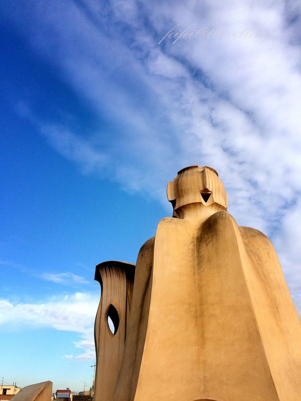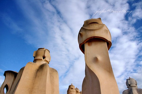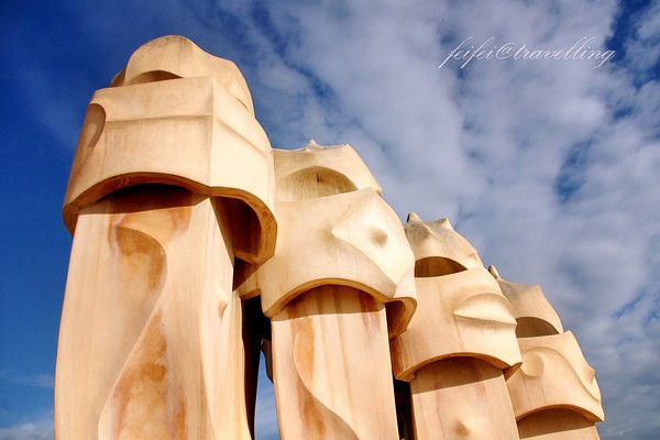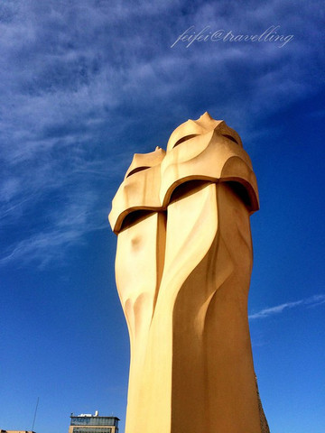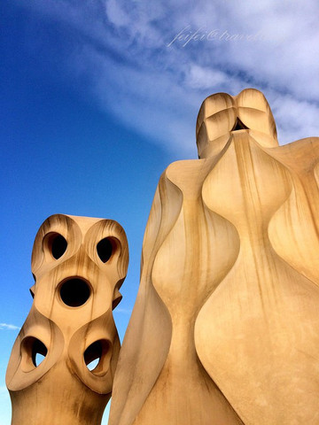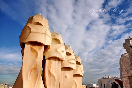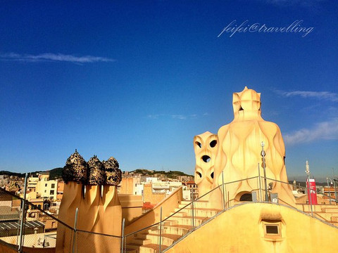在所有的 高迪建筑中, 米拉之家应当说是名气极大的,大家也都见过他标志性的螺旋烟囱。不规则的墙面和平台戴头盔的士兵造型的烟囱是它最著名的标志。