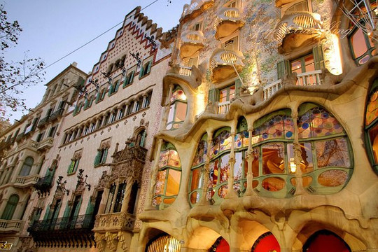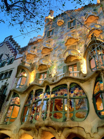 巴特罗公寓与高迪设计的其他建筑不同,它的外墙全部是由蓝色和绿色的陶瓷装饰的,一种奇诡的颜色组合,远望去颇象印象派画家的调色盘,但色彩很和谐,萨尔瓦多•达利曾经将这面外墙比喻为“一片宁静的湖水”。 巴特罗公寓的入口和下面二层的墙面都故意模仿溶岩和 溶洞,上面几层的阳台栏杆做成的假面舞会的面具模样,屋脊如带鳞片的兽类脊背,屋顶上的尖塔及其他突出物体都各有其怪异形状,表面贴以五颜六色的碎瓷片。巴特罗公寓(Casa Batllo) 的外墙缀满了蓝色色调的西班牙瓷砖。这座6层楼建筑物很怪异,它的露台设计像骷髅头,柱子像一根根骨头,屋顶则像满布鳞片的鱼背。