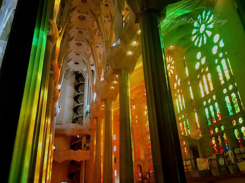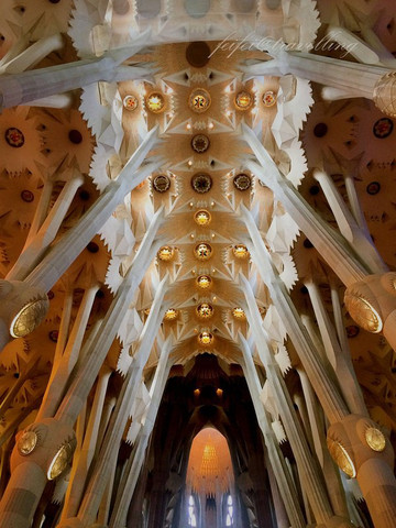 圣家族大教堂是一座宏伟的天主教教堂,整体设计以大自然诸如洞穴、山脉、花草动物为灵感。高迪曾经说:“直线属于人类,而曲线归于上帝。”圣家族大教堂的设计完全没有直线和平面,而是以螺旋、锥形、双曲线、抛物线各种变化组合成充满韵律动感的神圣建筑。