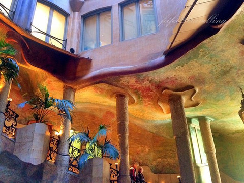 是高迪1888年所建,也是奠定高迪伟大的氛围空间创造者地位的作品。1984年, 古埃尔宫被选为世界文化遗产。古尔宫整体建筑隐身在窄巷中,因此从远处很难看见其建筑特色的全貌,铸铁的鹰雕大门显得整座建筑更有特色。而奎尔宫精彩细致豪华的内部装潢更是令人赞叹,苍芎天花板和梁柱街雕满了精致的艺术装饰,铸铁露台也是特色所在,看似整齐的外观其实皆为繁复的工法,而从大门直达马厩蜿蜒曲折的设计,更是在空间的设计上为创举,因此Bassegoda Nonell将奎尔宫誉为“高第首次宣示个人独特建筑理念的伟大作品”。