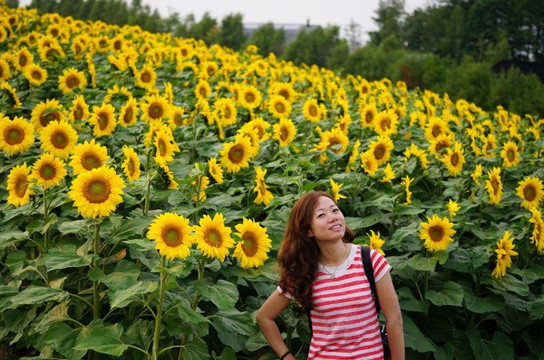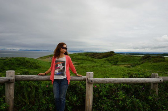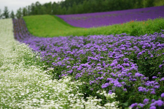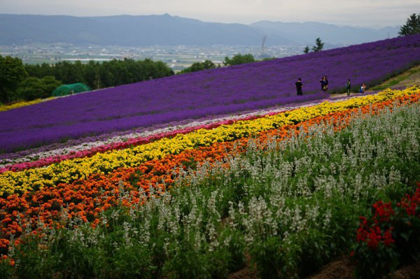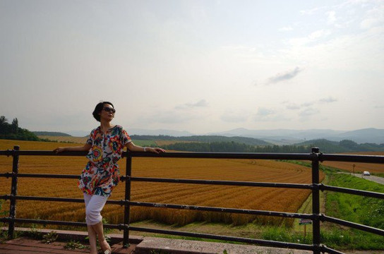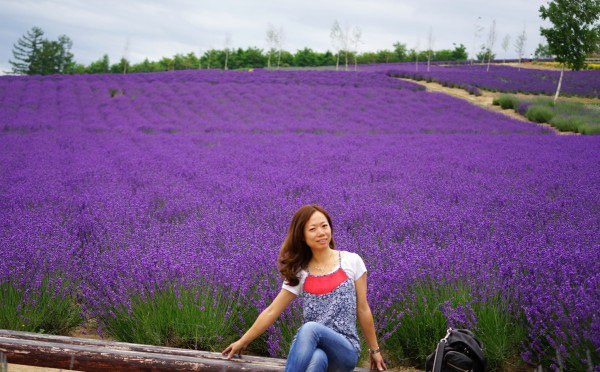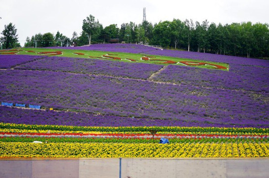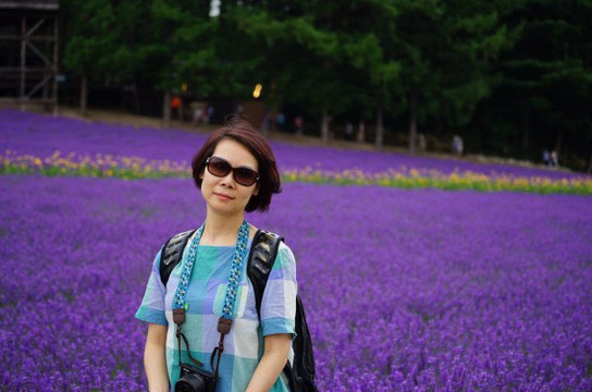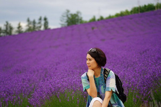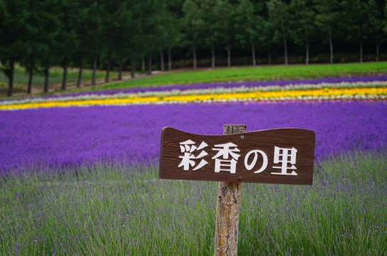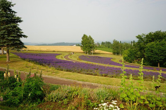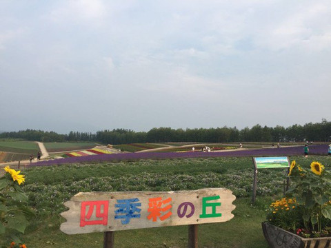 在富田农场休息完后,我们决定前往“彩香之里”。“彩香之里”距离富田农场大概3公里左右,可是因为有斜坡,再加上大热天的,走起来确实具体,我们选择打车前往。在富田农场请穿制服的工作人员帮我们预约了一辆出租,3分钟后我们又坐上了前往“彩香之里”的的士。车程大概10分钟,哇哦,一大片薰衣草田出现了,美极了!这里游客明显比富田农场少很多,我们兴奋地拍照,立即把自己融入这一片花海。“彩香之里”地势高,可远眺整个富良野市及远方的十胜山连峰。(爱)