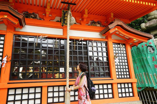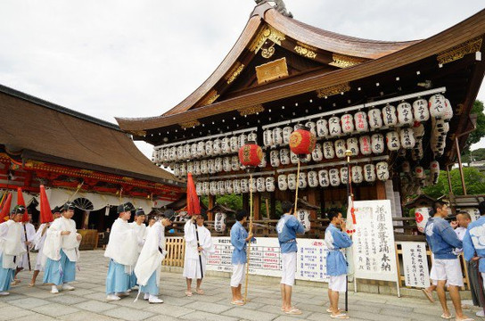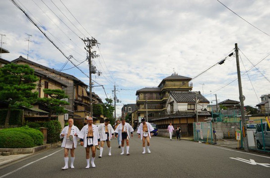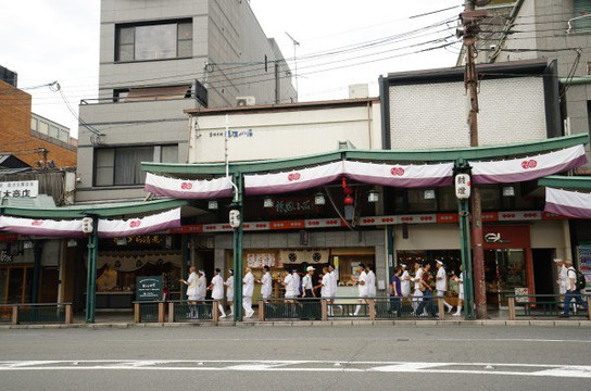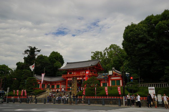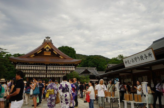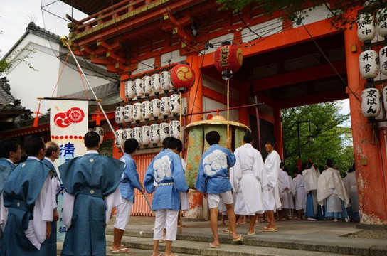 吃饱后就开始今天京都的行程了。本想在祗园会馆对面星巴客门口乘坐前往的公车的,结果被告知由于有活动,临时取消本站了。干脆我们就返回八坂神社。看见越来越多的穿着祭祀服装的人在聚集,原来今天有祢园祭,今天是后祭。祗园祭是京都一年中最大的祭祀活动,主源于1100多年前,当时疫病流行,为驱除病魔,人们自发组织了祭祀活动,流传至今。我们在八坂神社里目睹了一系列准备活动,参加祭祀的上有80岁的老人,下有10多岁的学生仔。敲锣打鼓中,一直把他们送出八坂神社。我们沿着八坂神社往长乐寺和円山公园游览。京都的人气很旺,祗园附近的景点有许多游客(其中一半都是中国团队) 天气也热,干脆顺路走回酒店,休息。
