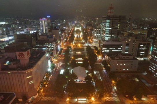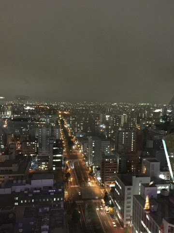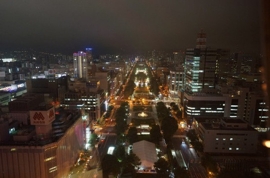 大约40分钟的安静车厢的飞快行进,到达了JR札幌站。顺着一半中文的指示,我们走出了JR站。天色已黑,很远就能看到札幌电视塔,这是札幌的标志建筑。按照最初的计划,今天下午有个的行程的,可是航班原因,只能取消。我们沿着JR札幌站大概走了将近10分钟,到了一家星巴客就到了我们预订的酒店札幌格兰大饭店SAPPORO GRAND HOTEL。其实攻略上说不用出JR札幌站,沿着地下通道就可以直接到达这家酒店的大堂,酒店位置还是很好的。刚到一个新城市,走到街道上看看街景,也是不错的选择。酒店迅速的CHECK IN 后,行李生帮我们把行李送到房间后,我们稍作休整,出发看夜景加晚餐。