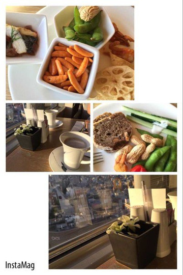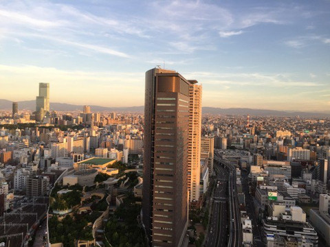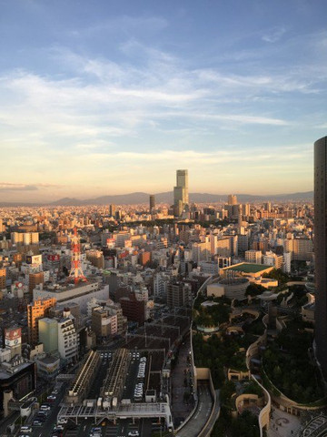 听着舒缓的背景音乐,一边欣赏大阪市区景色,一边漫不经心地点心水果咖啡吃了个全饱 。
