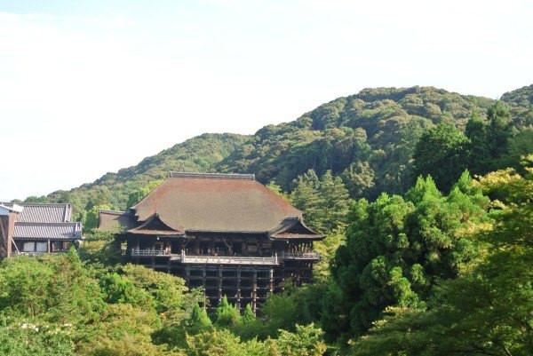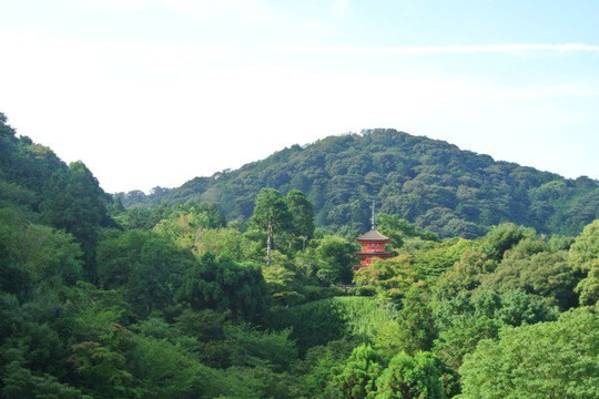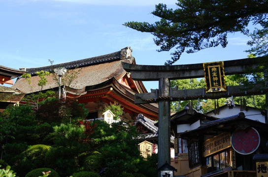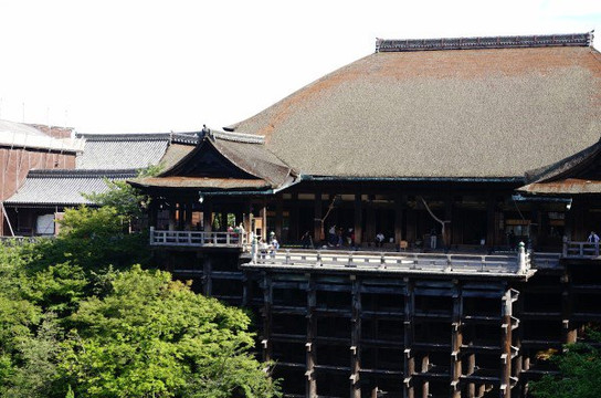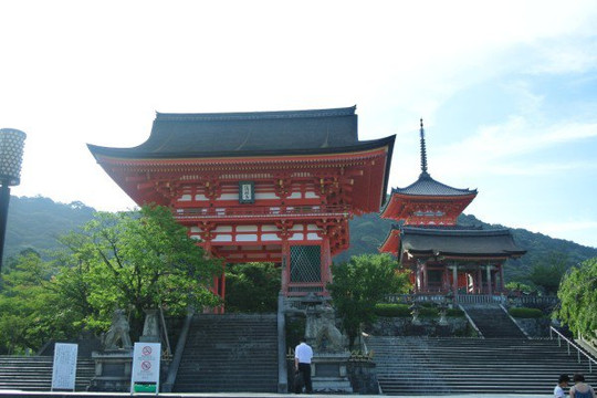 和酒店预约早餐时间是8点半,我们起个大早,前往清水寺。清水寺早上6点就开门了。早上去一方面人少,而且不热。日本天亮得早,7点过,太阳已经很大了。从酒店门口出来的公交站乘202路两站路就到清水寺了。沿着石板路走大约10分钟,我们到达了清水寺。清水寺(门票300円),是京都很古老的寺庙,建于798年,重建于1633年。清水寺是京都最著名的地标建筑。清水寺的主殿有巨大的长廊,下部由众多圆木支撑,悬空倚建在山坡之上。清晨走在清水寺里,空气清新,在音羽瀑布用舀子汲取清水,祈福祝愿。树荫影影绰绰,带给人一天的好心情。
