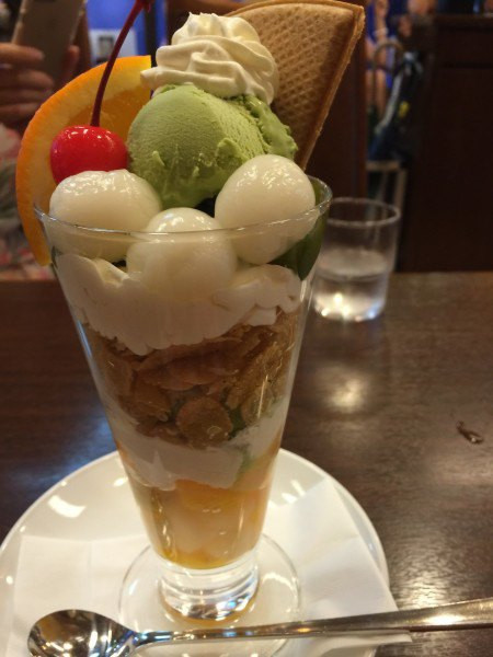 我们在花间小路路口一个环境很好的咖啡间里坐着休息了许久,每人点了一杯相当高热量的冰淇淋。(害羞)慢慢溜哒回酒店的路上,看到许多警察在维持秩序,八坂神社门前的石梯上坐了许多人,原来下午的祗园祭只是一部分,晚上才是重头戏!赶紧找个石梯坐下,等待晚间表演开始。