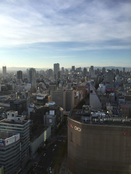 酒店楼下就是高岛桥,里面有很多日本品牌的衣服,2楼也有国际大牌。逛完高岛桥,沿着心斋桥的方向走,顺便解决午餐问题。中午的大阪太阳也不小呢! 最后在一家串烤店吃了一顿味道相当不错的烧烤餐,点菜妹妹中文流利。带着任务来到了心斋桥对面一家很大的免税店,于是各种挑选,最后提着满满的战利品打车回酒店。出租司机服务非常好,直接把我们开到酒店大堂门口---原来6楼的大厅有另外一个专门的汽车通道,立马酒店服务生帮我们提战利品到沙发边---贴心服务很赞!取了房间的钥匙后,直接回房间休整。房间是一个套房,面积很大,位于28层,视线很好。