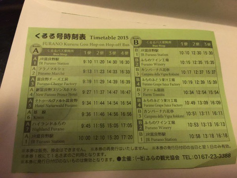 富良野车站右边就有INFORMATION中心,里面有会中英文的工作人员可以给我们一些游览建议。我们在这里购买了富良野KURURU BUS 的票,每人1200円,可以2日内在富良野随上随下游览巴士。票后面有每个景点的时刻表。我们根据时间决定先到酒店把行李寄存,然后在酒店门口乘坐公交去新富野王子饭店,下午14点47分再坐A线转车去JR富良野站乘15:30的B线去富田农场和彩香之里。