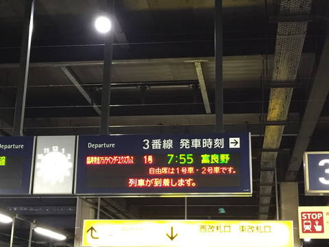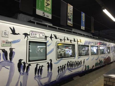 早起,准备乘坐早上7点55分的熏衣草特急1号车前往富良野。格兰大酒店提供日式和西式早餐,品种丰富。早餐后通过地下通道不到10分钟我们就到了JR札幌站。根据电子屏幕的显示,找到了站台,看到了传说中超有爱的彩色列车。(爱)我们坐的指定席,这班车是最早一班,车内比较空,很舒服,一如既往的安静。9点52分,JR到达了富良野车站。
