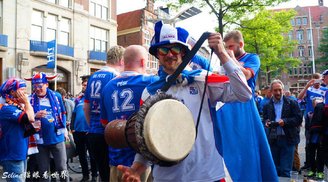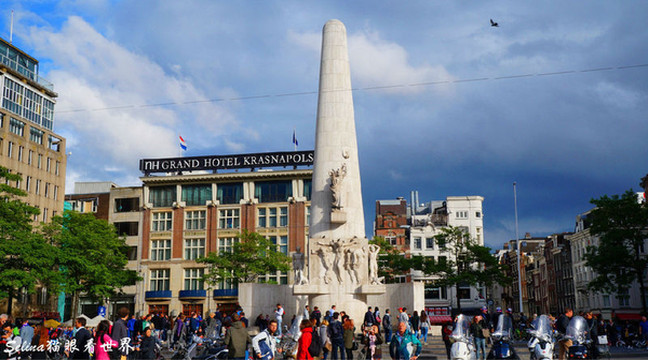 广场上另一个引人注目的建物就是王宫对面高耸的国家纪念碑,这是为了纪念二次大战期间受纳粹迫害的牺牲者所设立的。每年5月5日的解放纪念日,都会在此举行追思的活动。而平常日子,这里也非常热闹。我们到这里的下午,不知道赶上了什么活动,一群蓝色军团聚集在此“群魔乱舞”!敲敲打打、呼号呐喊……如果猜得不错,应该是即将开始一场球队比赛,或是获胜的庆祝吧?