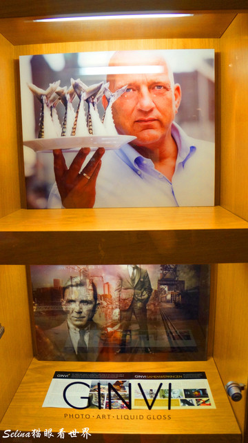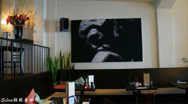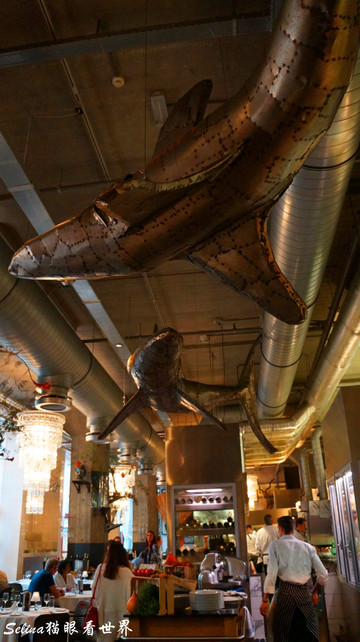 进门左手边的格子架里,摆放着不少照片和小物件。餐厅主人、荷兰的明星大厨Herman den Blijker先生的照片赫然在列。抬头仰视,铁片凝结而成的两条鲸游曳于一片钢管之间。