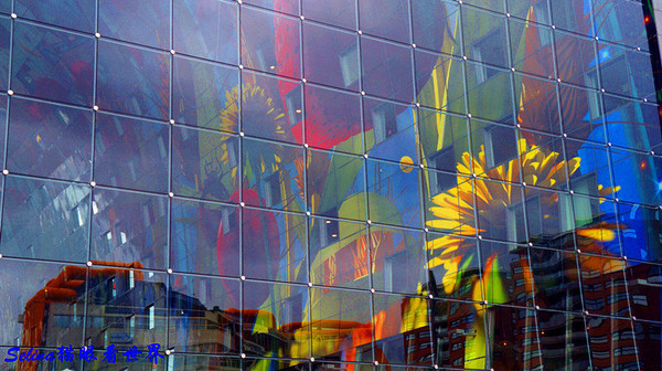 站在这座被称为现代版的西斯廷教堂的Markthal大型拱廊市场前,我完全理解了北京的中央电视台新址大楼的设计理念。通透的玻璃幕墙反射着对面的蓝天及城市,如果不是阴天,那映射的景色必然是迷人眼的!市场内部的拱形穹顶缤纷绚丽的壁画,隐隐透出玻璃幕墙,两种形成鲜明对比的元素,构成了一幅光影交汇的印象派。