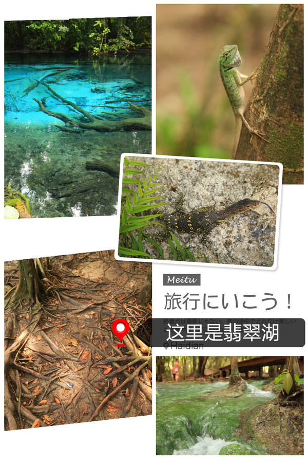到了码头有车来接我们,今天回甲米住,明天飞清迈了,在路上经过甲米附近比较著名的翡翠湖,看攻略上写,翡翠湖是一个当地人日常都爱玩的地方,很多人穿着普通的衣服就钻进湖里泡泡祛暑,翡翠湖其实很大,因为时间太赶我们就在这里玩了1个多小时,有点不进行,湖水的最上方是一片大瀑布,我们没有时间走过去了,瀑布前面就是图片上的翡翠颜色的湖水,蓝绿蓝绿的透明的,很多木头在水中映衬着像九寨沟的感觉。这里人并不多,还有很多野生动物随处可见非常原始。