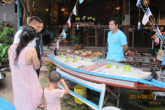 看了看吃饭的几个地方,菜单其实差不多,价格就相差很多了,有的地方炒饭就100泰铢到120泰铢而已,但是有的地方就要到400泰铢,不知道里面放了什么山珍海味啦。挑好了一家我们决定晚上来吃吃,后来没想到的是,连续4天我们都是在这家吃的晚饭。哈哈哈哈。