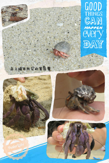 浮潜不说什么了,只说一个,中午的时候,开船的船老大把我们放到一个小孤岛上休息和吃饭,这个岛就是沙滩的一片能坐着,后面的山和树都巨高无比,简直跟阿凡达电影里一样。我们正在吃饭和聊天发现一个巨型寄居蟹大摇大摆的从我们面前爬过,这时我们才惊喜的发现,这简直就是寄居蟹岛啊,大大小小的寄居蟹真可以用成千上万只来形容了。我们抓起几只照相玩乐玩,真的很有意思,不过应该保护生态,玩一下就把人家放回去哈哈哈。