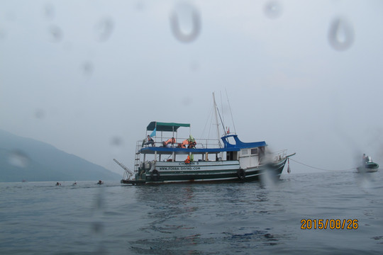 当天,又是跟我们来的那天一样,风雨雷电就在头上卡卡卡响,因此海里的颜色就浑浊了一些,后面可以看到第二天的水下照片都比今天的清楚一些,因为后面那天就晴空万里了。