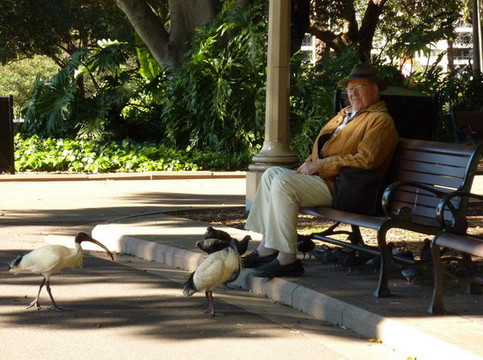 给鸟儿们喂食的老人