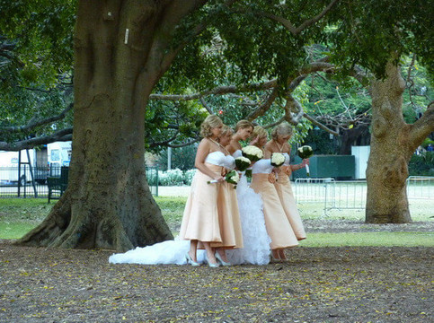 穿行于植物园中,遇到拍婚纱照的新人;这是新娘和伴娘们