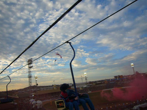 乘着缆车去嘉年华,突见体育场内放出粉红色的烟雾,原来是迎接跳伞队伍