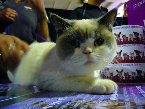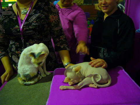 这是最珍贵的无毛猫,好惹人怜爱哦,主人让我们摸摸它,果然热热的,据说它的体温比一般猫高,有39度,所以没毛也不怕冷。