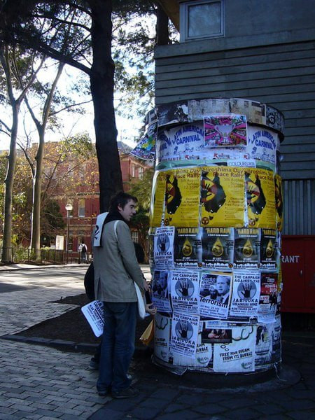 两位学生在海报筒上贴讲座海报,标题是:马克思主义者看待恐怖主义的态度
