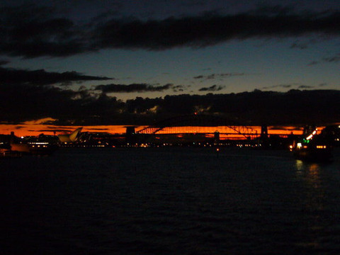 晚上乘游船夜游,悉尼的夜景还是蛮美的,只是船太晃,拍得照片都抖掉了,只有这张还凑合,可惜歌剧院和海港大桥已经渐远。