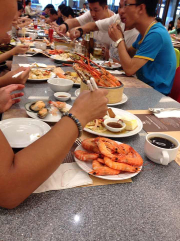 先赠送个海鲜自助,没体力顾客还怎么买东西!太人性化了。但我对这东西没兴趣,咽了几口.