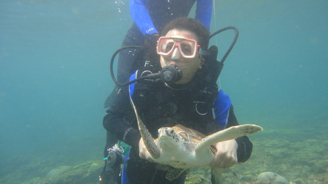 6、潜水时—要注意安全,要选择有信誉的潜水中心或旅行社,并跟随有经验的潜水教练。如果身体 不适,饮酒后,或者没有潜伴,则不应进行潜水。单日单次 潜水后,12小时内不宜乘坐飞机。 单日多次潜水后,24小时内不宜乘坐飞机,否则容 易患上减压病。
