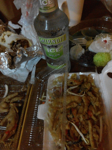 照例在排挡买了两个小菜,两瓶预调酒准备宵夜。正准备回酒店好好休息,看到四个伙伴们在路边小店里向我微笑...纠结下...拼了,来吧继续喝