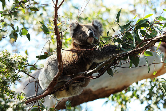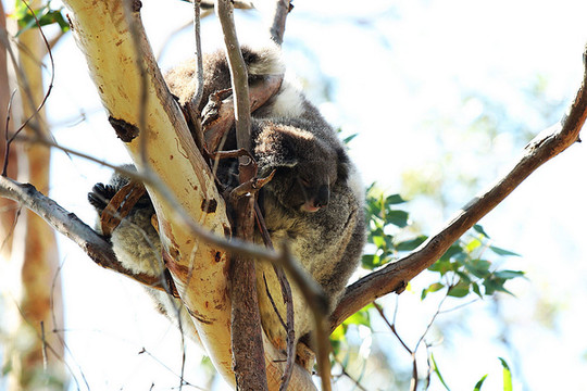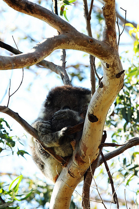 拍不到清晰的照片继续向前,又是跟风下车,又是两只,一只在睡觉,一只在吃叶子。这次距离稍近了些。旁边一个外国老头指着那只大嚼桉树叶的考拉,热情而温柔地说:It is eating。