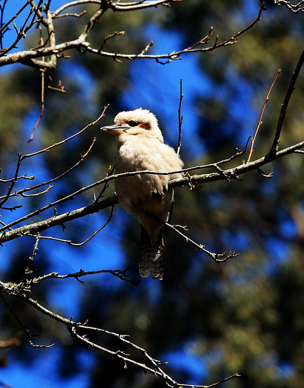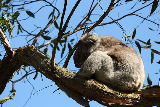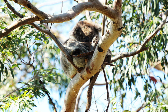 开了不久就看到有车停在路边,几个游客站在树下仰头拍照,于是跟风下车,经过指点才在树尖儿上看到一只考拉抱着树枝在睡觉,另外不远的一棵树上,还有一只考拉在移动。尽管距离很远,大家显然都很兴奋,估计都是第一次看到野生考拉。
