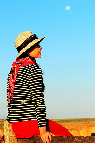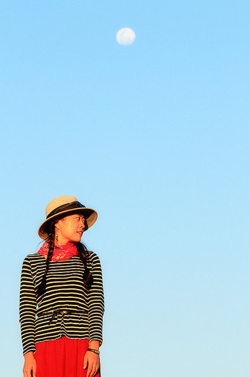为了拍到跟月亮的合影,尝试了不同手段:坐在围栏上,坐在椅背上,站在草地上,最后还站在了停车场的木桩上。