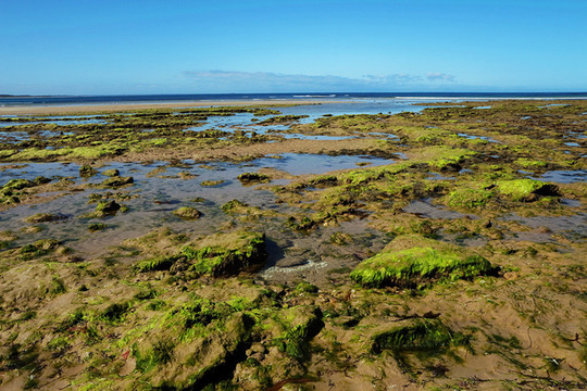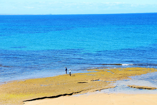 走下栈道,来到岸边海浪很大,海藻很绿。