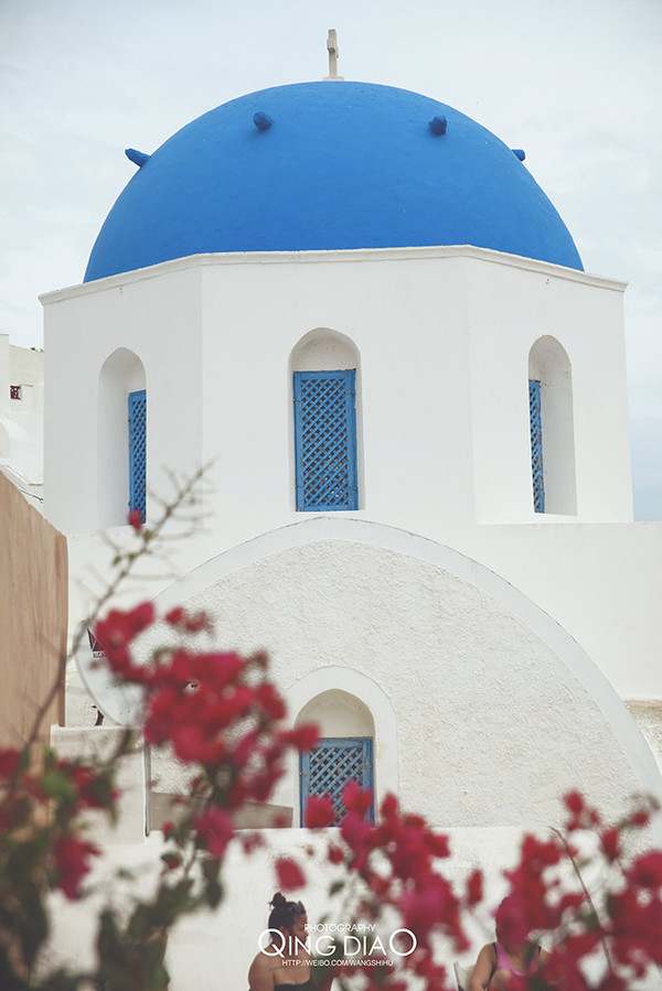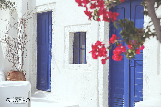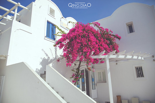 在这里只有白和蓝,然后配上红色的花更加耀眼。