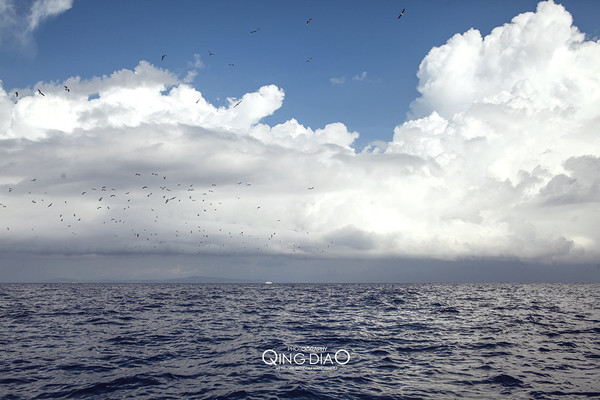 海上的云层总是很丰富,前面的海鸥看到我们的船来了全跑了。