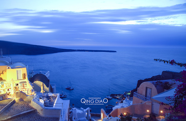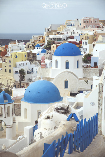 对于黑黑的火山土壤岛,这些白色和蓝色的房子显得特别的显眼。