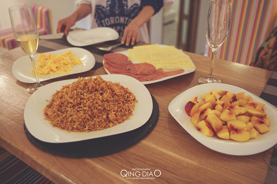 吃了一个多星期的意面和披萨有点受不了,我们自己在超市买了米饭、鸡蛋、午餐肉和黄桃,然后做了一顿丰盛的晚餐,这炒饭简直是太好吃了,如果有点老干妈会更好!!!