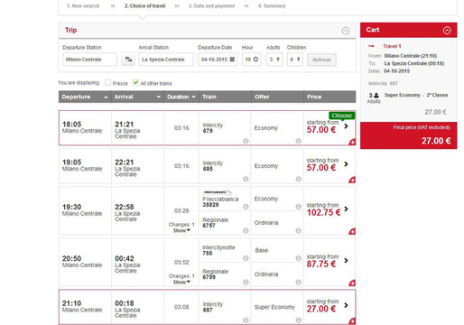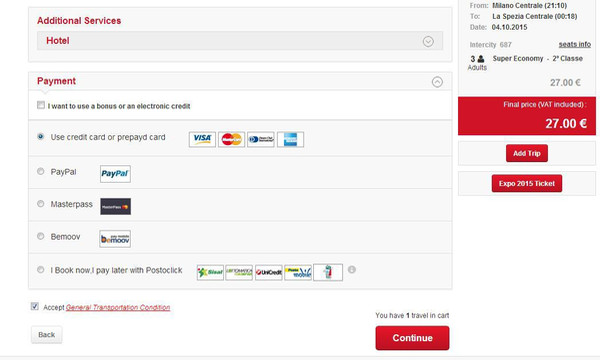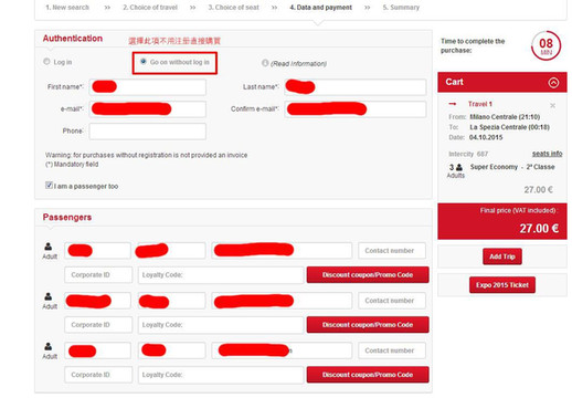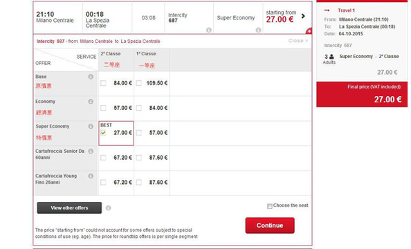 在国内买意铁票有很多选择,携程上也可以代购,需要30元每张的代购费,但方便,中文显示清楚,直接买好票寄到你提供的地址,反正不是官网的渠道购买都是要交代购费的,只有意铁官网买才没有代购费,并且可以选位置,而且不用注册,支持VISA付款。