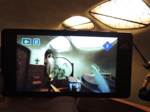 超级喜欢巴特罗公寓的讲解机,很好玩的彩屏,对着一个景点的时候,就开始放动画片。用屏幕告诉你此处在高迪脑海中的画面。比如窗子是游泳的海龟,墙上有宝石,普通地板铺上华丽的地毯。