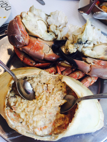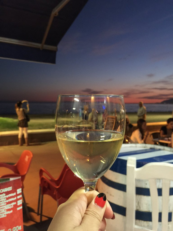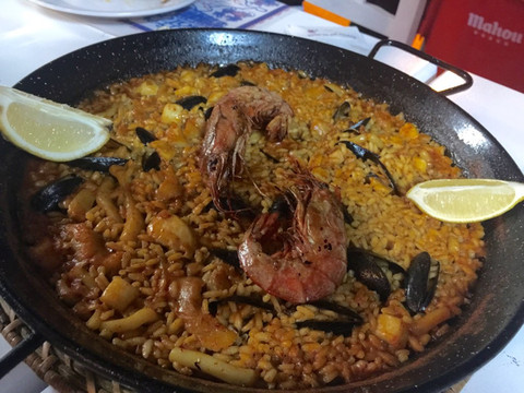 面对沙滩有一长串的餐厅,我和团友最后选了一家披萨店。但点菜难度明显增加,店家的英文几乎为0。硬起头皮点了一堆,已经习惯没有酒水单,就喊一瓶白葡萄酒配餐。但这是我第一次面对大海吃饭,并第一次在西班牙吃到海鲜饭,还是很激动。