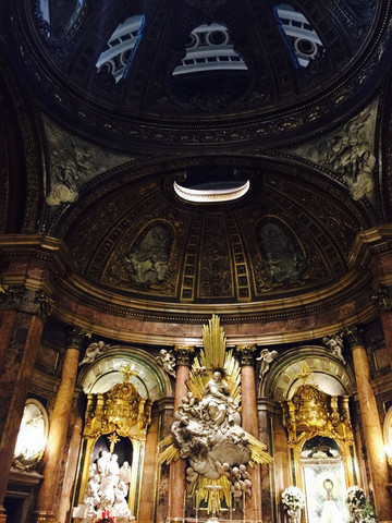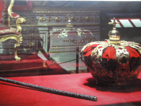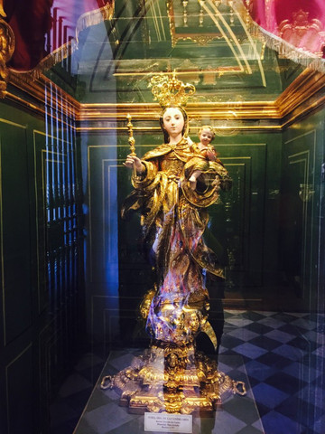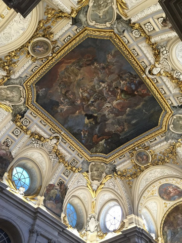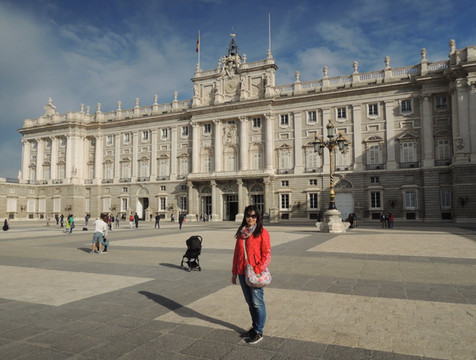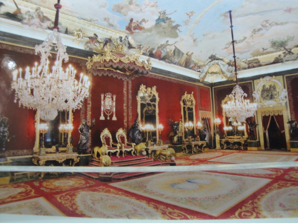 那天最重要的景点就是马德里的大皇宫。马德里的大皇宫与巴黎的凡尔赛宫、维亚纳的美泉宫并称为欧洲最有名的三大皇宫。一样有官导,但是很可惜,官导就是发发讲解器,还是导游来讲。我觉得有一个厅特别像凡尔赛宫的镜厅,就是稍微短一些。墙上的画像挂毯,满地的红色大理石装饰都是西班牙皇宫的特色。有的厅会把白色的陶瓷雕像用螺丝固定在墙上,有的厅有好多绿色藤蔓花纹,劈头盖脸的眩晕。内部不允许拍照,就拍了入口处头顶的一副巨型油画,也是够震撼的了。后2张是翻拍纪念品上的图片的,再次回味下。