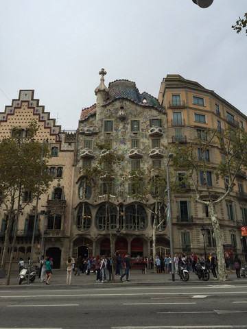 出了火车站,按照之前的攻略买T10地铁票,可以一张票使用10次,并可多人使用。(10欧,单程一张票是2欧)我们4个一个接一个地过闸门,第一个人塞票进闸机,小门打开过去后,票子弹出来给第二个人拿,如此反复,我断后。换乘不复杂,指引很清晰,感觉钻了好多小山洞。不一会就到了我们的第一个目的地,巴特罗公寓。(地铁L3,绿色线,站名:passeig de gracia)