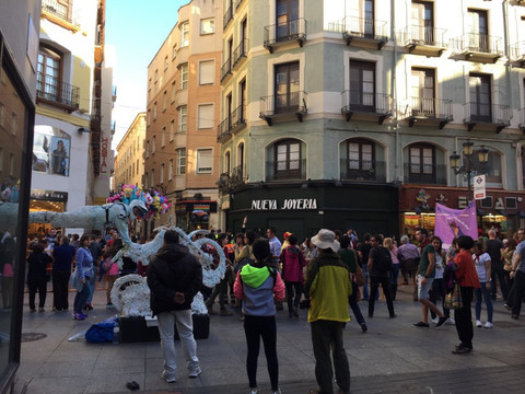 一路飞车赶往萨拉戈萨,正好碰到圣母玛利亚节。明明是相当于国内菩萨生日的节日,被西班牙人搞成了狂欢节。大队的人在街上游行,唱歌,跳舞,我也捡到一个气球和他们一起跟着节奏甩。