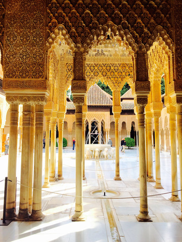 第六天驱车赶往石榴城格拉纳达,这一整天都弥漫了浓浓的阿拉伯风情。第一个景点是阿尔罕布拉宫。它是摩尔人留存在西班牙所有古迹中的精华,有“宫殿之城”和“世界奇迹”之称。