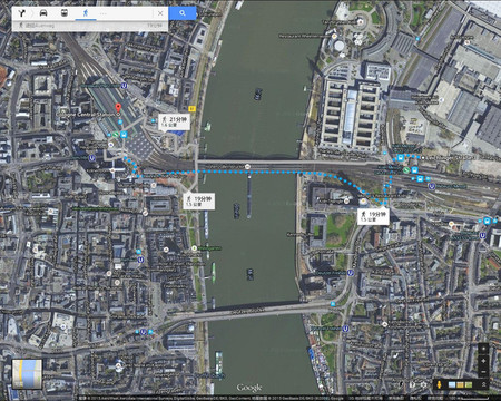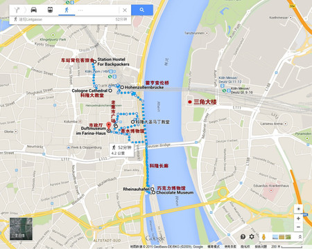 下图中是我制作的科隆景点路线图,当初制作这个图时,方案还是在科隆住一夜呢,后来改到当晚到阿姆斯特丹住了。可以看出,主要的景点都在西岸这边。东边只有一个三角大楼。