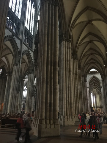 一般教堂的长廊,多为东西向三进,与南北向的横廊交会于圣坛成十字架;科隆大教堂为罕见的五进建筑,内部空间挑高又加宽,高塔将人的视线引向上天,直向苍穹象征人与上帝沟通的渴望。
