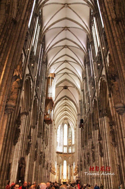 只见这座用磨光大理石砌成的大教堂,其内外雕刻物皆似鬼斧神工之作;教堂里森然罗列的高大石柱,鲜艳缤纷的彩色玻璃,精致的拱廊式屋顶以及凌空升腾的双塔皆气势傲然。登至150多米的塔顶,俯瞰市区,科隆美景一览无遗。科隆大教堂的巍峨壮观令所有瞻仰到它的人叹为观止。