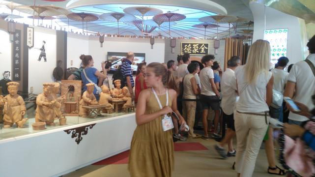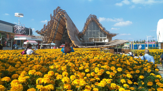 哇,这是中国馆!中国馆是展会第二大场馆(德国馆是第一大)。馆前是一大片金黄色的花海,展馆屋顶像麦浪,建材用竹子,突出低碳环保理念,花海衬托麦浪起伏的屋顶,画面很和谐很美,我不由得想起上届上海世博会的那个中国馆,那个红色的“东方之冠”,大中国,大智慧!排队参观中国馆的人非常多,得排好长时间才能进馆,参观者很多是外国人,而有的场馆很冷清,没几个人进去看。这一热一冷说明什么?说明中国馆很有特色很有创意,作为中国人我感到很骄傲。
