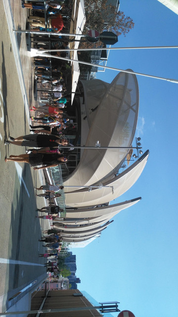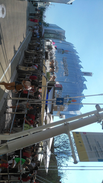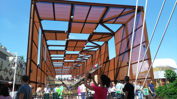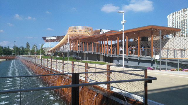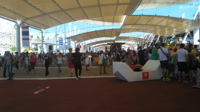 这条顶上有浅黄色棚盖并一直向前方延伸的长长的路就是世博大道,所有的参展场馆都面向这条大道,这是米兰人的一大创新,往届世博会都是按地域按地球几大洲来安排展馆,今年就打破了这个传统,不分什么亚洲区欧洲区,反正走完大道两边的场馆就算看完了。不过,143个国家参展,要走完所有的场馆可不是一件容易的事啊,如果每个馆都仔细看,至少要走一整天。